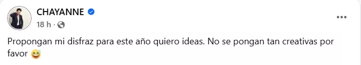 Chayanne volvió a hacer de las suyas en redes sociales y, como suele pasar, bastó una frase para que sus seguidores lo llenaran de comentarios. El cantante publicó en su cuenta oficial de Facebook: “Propongan mi disfraz para este año, quiero ideas. No se pongan tan creativas, por favor”, y dejó la convocatoria abierta para la elección de su atuendo de este año.