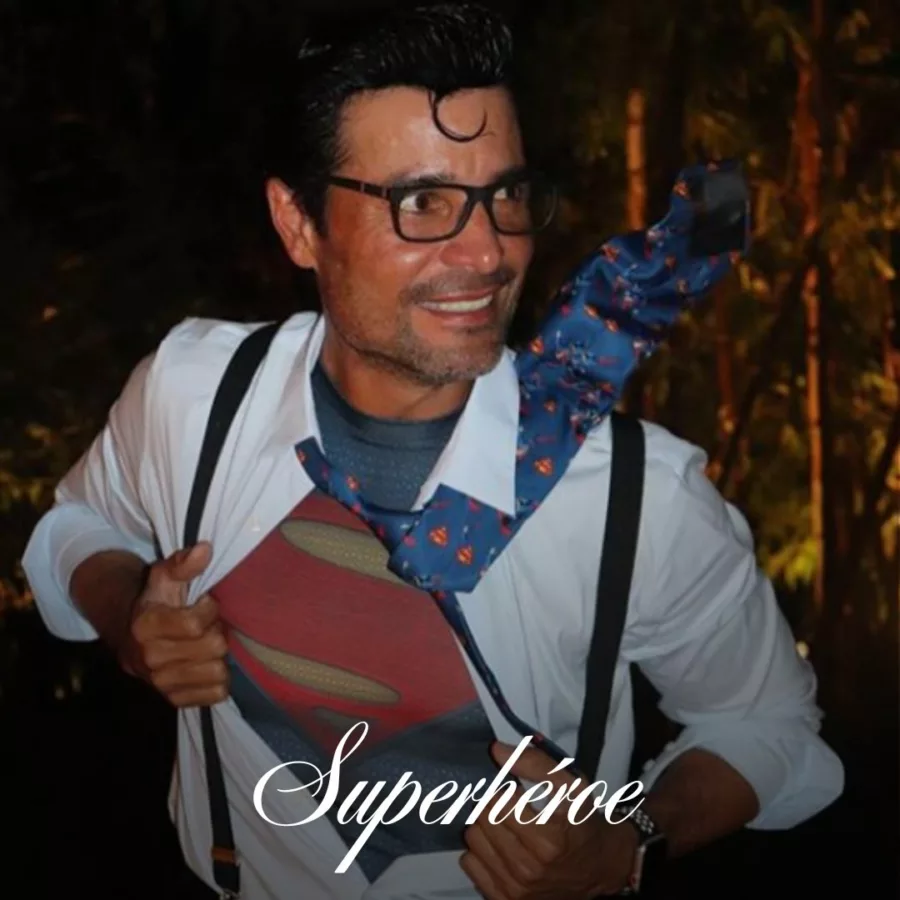 La publicación incluyó una galería de fotos en la que recordó algunos de sus disfraces más icónicos. En una de ellas aparece convertido en “Superman» al mostrar su versión más elegante de Clark Kent, con camisa blanca y lentes, listo para transformarse en héroe.