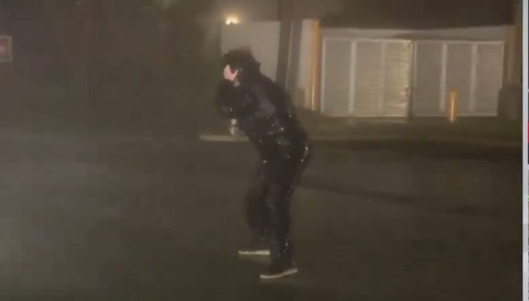 De un momento a otro, McCollum decidió ponerse en cuclillas, con una rodilla en tierra, para soportar las intensas ráfagas que la hicieron tambalearse, pero sin caer, mientras continuaba su reporte.