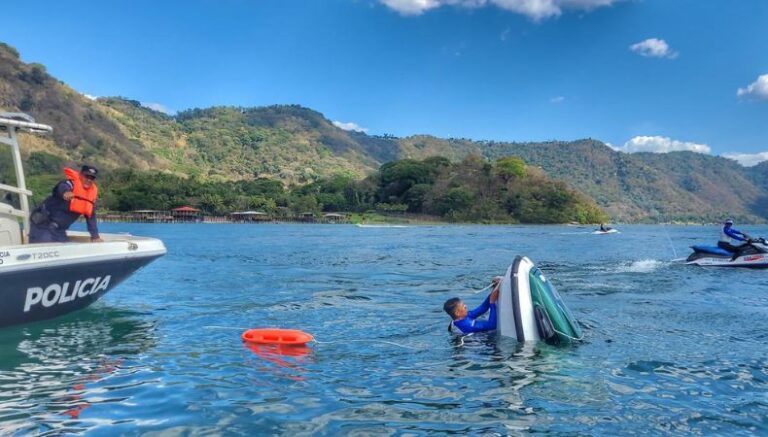 Los turistas fueron rescatados este viernes por elementos de la División de la Policía de Turismo (Politur), luego de que la moto acuática en la que se transportaban volcara en el lago de Coatepeque, en el distrito de Santa Ana Este.
