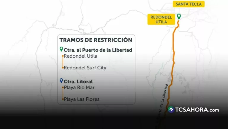 Las restricciones aplican en la carretera al Puerto de La Libertad, entre el redondel Utila y el redondel Surf City, y en la carretera Litoral, entre playa Río Mar y playa Las Flores.