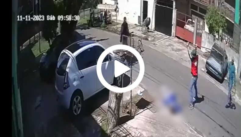 Luego de ello, dos personas que se encuentran detrás de quien conduce la bicicleta, se acerca a un poste del tendido eléctrico, toma una varilla de hierro y se la entrega a quien porta la chaqueta. Seguido a ello, y sin mediar palabras, le pega con mucha fuerza, hasta tumbarlo al suelo.