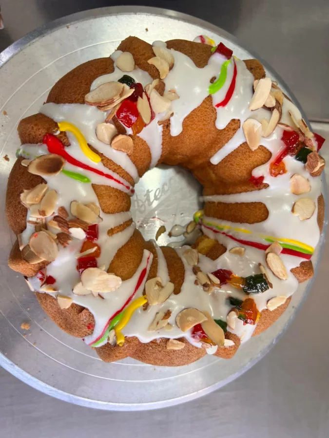 «Como primer paso tenemos que asegurarnos que lleve el Niño, ponemos el glaseado que se prepara previamente con azúcar glass… luego le vamos a poner un poco de color, que son las franjitas de colores: rojo, verde, amarillo y luego lleva la fruta confitada para darle todavía más color», añadió Mirella Castillo, quien se encarga de decorar cada una de las roscas.