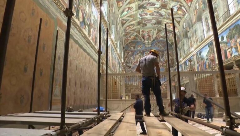 Un video difundido por la Santa Sede muestra a los trabajadores colocando andamios bajo los frescos de Miguel Ángel, así como un falso piso de madera para poner encima grandes mesas donde se instalarán los 133 cardenales electores para el cónclave.
