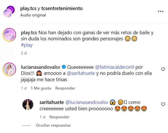 Entre quienes reaccionaron estuvo Luciana Sandoval, quien respondió en los comentarios con humor. “Queeeeeeee @fatimacalderon9 por Dios!!! amoooo a @saritahuete y no podría duelo con ella jajajaja me hace trizas”, escribió. A lo que Sarita Güete respondió: “@lucianasandovalsv como creeeeeeee usted bien prooooooo”.