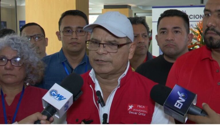 El secretario general del FMLN, Óscar Ortiz, brindó unas palabras a la prensa, durante su observación en el escrutinio final para el Parlamento Centroamericano (Parlacen) y los diferentes Concejos Municipales, para los 44 distritos.