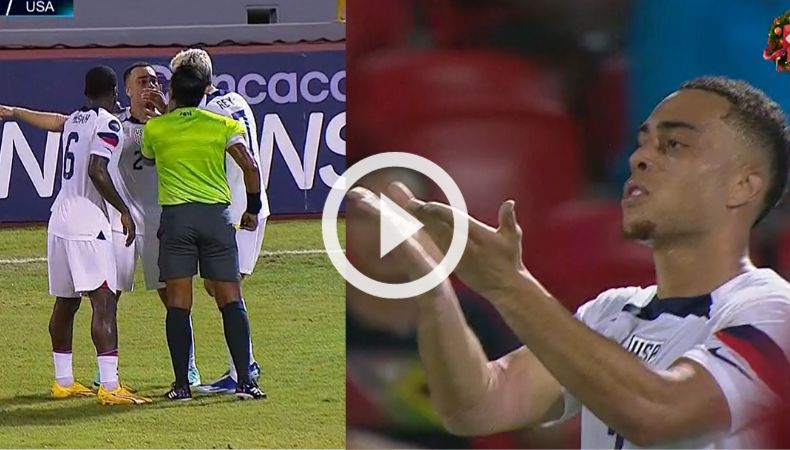 Con el 0-1 a favor del Team USA, el jugador norteamericano intentó evitar que el balón saliera del campo luego de un mal pase, pero el árbitro Walter López indicó saque de banda para el cuadro trinitense, de acuerdo a la orden de su asistente.