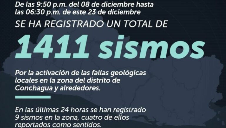 El Ministerio de Medio Ambiente y Recursos Naturales (MARN) reportó que los sismos en Conchagua y sus alrededores, registraron, 1,411 réplicas. Esto, tras haber ocurrido el sismo de magnitud 5.8 a las 9:50 p. m. del pasado 8 de diciembre, hasta las 6:30 p. m. de ahora. Además, de esa cantidad, un total de 184 se percibieron por la población. Las magnitudes de estos sismos estuvieron entre 2.5 y 5.0.