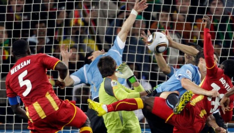 Un lanzamiento de falta en el minuto 120, terminó venciendo a Fernando Muslera, en un instante o una milésima de segundo, el atacante Suárez detuvo el balón en la línea con la mano y negó un gol casi seguro.