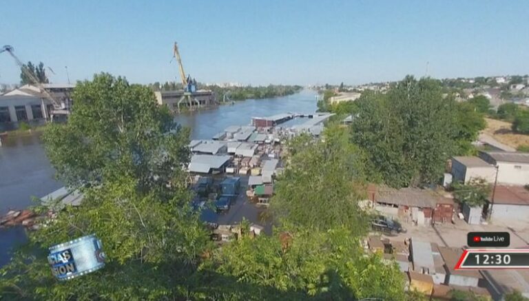 Según los inspectores del OIEA presentes, el nivel de agua en el embalse baja a un ritmo de unos cinco centímetros por hora y alcanzó los 11,62 metros, frente a los casi 17 metros de antes de la voladura de la presa el pasado martes.