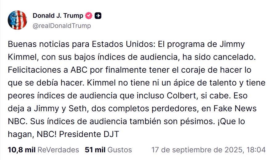 Por su parte, el presidente Donald Trump, desde su red Truth Social, celebró la suspensión con dureza: “El programa de Jimmy Kimmel, cuestionado por sus bajos índices de audiencia, ha sido CANCELADO. Felicidades a ABC por haber tenido finalmente el valor de hacer lo que había que hacer. Kimmel no tiene NINGÚN talento”. El mandatario también aprovechó para presionar a NBC a que saque del aire a otros presentadores como Jimmy Fallon y Seth Meyers.