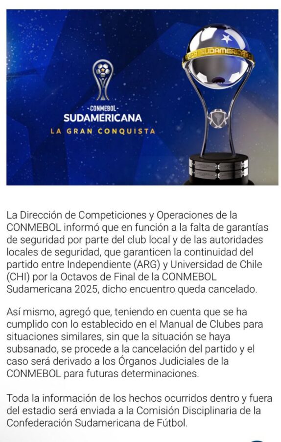La Dirección de Competiciones y Operaciones de la CONMEBOL informó que, en función a la falta de garantías de seguridad por parte del club local y de las autoridades locales de seguridad, el encuentro quedó suspendido.