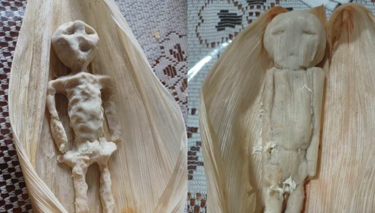 Es decir, basta con tener un poco de masa, rellenarla con los ingredientes de tu preferencia y darle el modo amorfo de los supuestos “aliens” parecidos a los que Maussan presentó recientemente. Posteriormente, se envuelven en hoja para tamales o se fríen en una sartén.