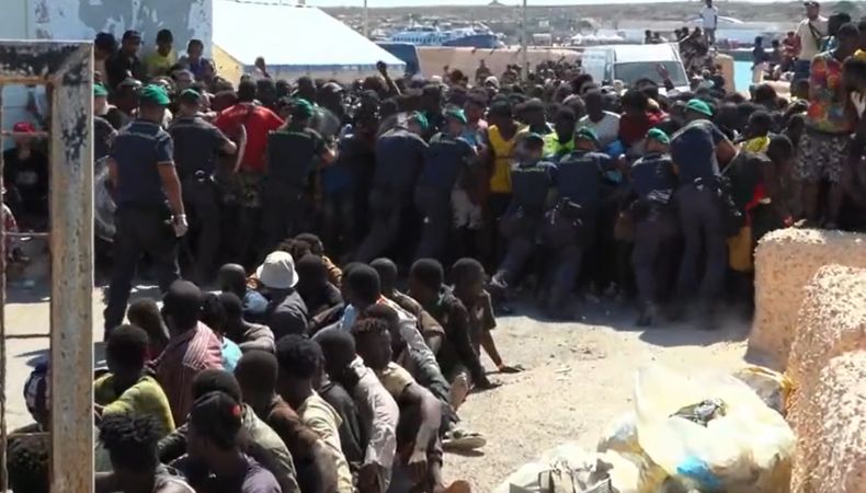 La llegada de alrededor de 6,000 inmigrantes en las últimas horas a la isla italiana de Lampedusa (sur), frente a las costas africanas, ha desatado el caos. La policía ha tenido que delimitar con sus escudos la aglomeración de personas en su puerto.