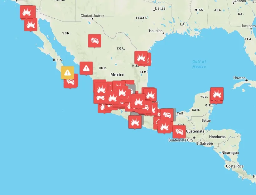 En el portal web “Aliado by Aleph“, que es una herramienta tecnológica enfocada en la seguridad y la gestión operativa, se puede observar un mapa de la violencia desatada en México por el CJNG, tras la muerte de su líder. En el mapa se señalan en tiempo real los lugares en los que se realizaron acciones violentas como bloqueo de carreteras, incendio de vehículos y comercios.