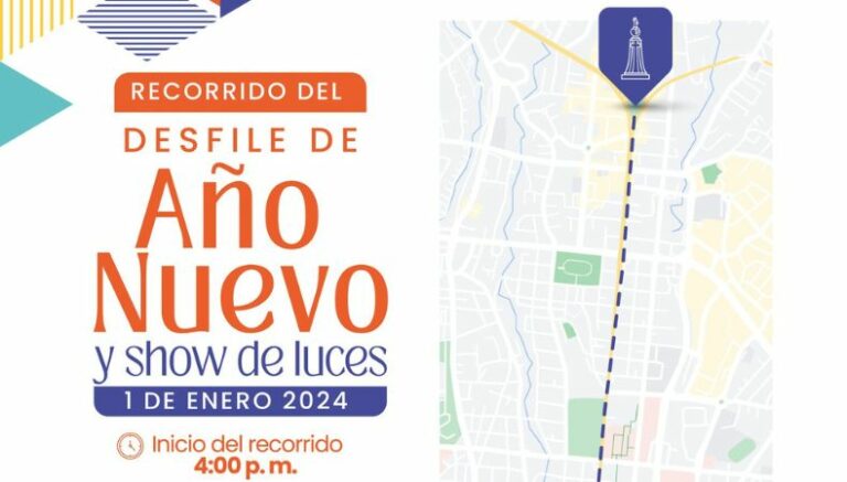 El Ministerio de Cultura llevará a cabo este lunes 1 de enero el “Desfile de Año Nuevo y show de luces” desde las 4:00 de la tarde. El recorrido iniciará en la Plaza Divino Salvador del Mundo y culminará en la Plaza Cívica Gerardo Barrios del Centro Histórico de San Salvador.
