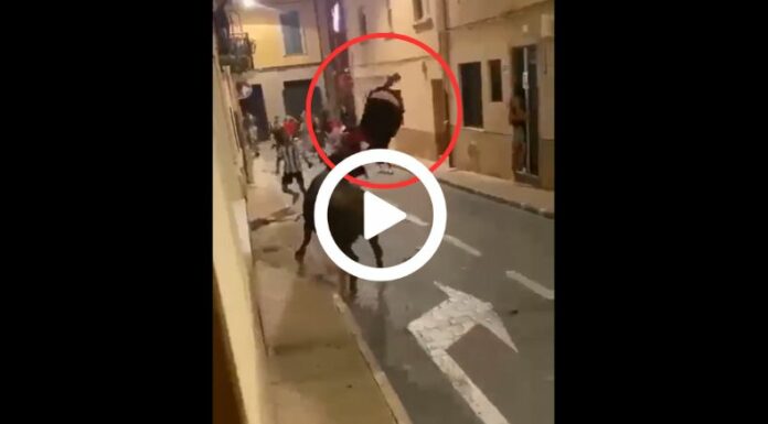 En redes sociales se hizo viral un video que muestra el momento en que un toro suelto en una calle del municipio de Castalla, provincia de Alicante, España, embate con todas sus fuerzas a un joven de entre los tantos que circulaban y rodeaban al animal en el punto.