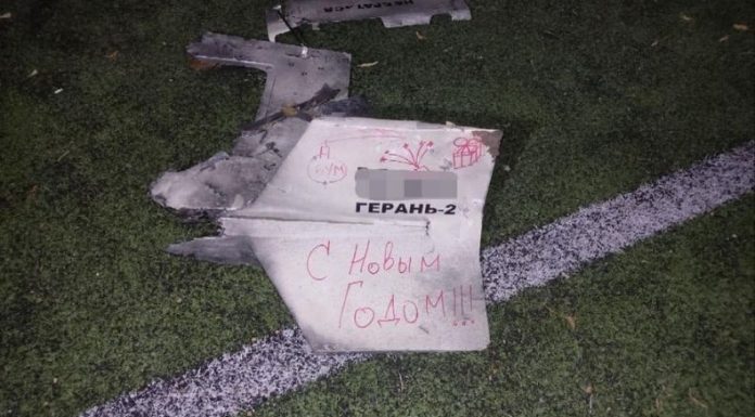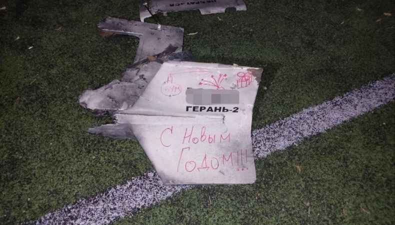 El jefe de la policía, Andriy Nebitov, publicó en Facebook una imagen de los restos de un dron derribado en el que se podían leer las palabras “Feliz Año Nuevo” en ruso.