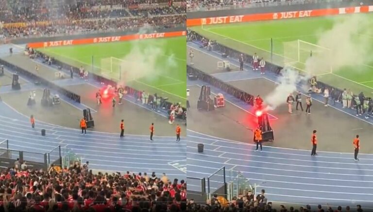 Por su parte, un incidente similar ocurrió minutos antes, cercano al 70′ del compromiso. Según se puede ver en los videos que recorren el internet, un encargado de dar seguridad sofocó un conato de pólvora antes que causara daño a los presentes en la pista olímpica, sobre todo periodistas, justo detrás de la portería de la Roma.