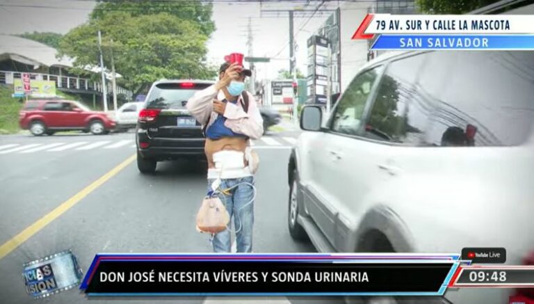 José no puede trabajar, pero la necesidad de comer han hecho que pida limosna en la 79 avenida sur, calle La Mascota, San Salvador, donde expone sus heridas con las sondas que debe cargar.
