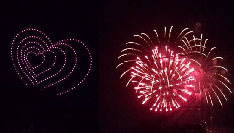 En el evento, los asistentes fueron testigos de un show diferente; ya que, este incluyó todo un espectáculo de drones, que formaban diferentes figuras en el cielo de Santa Tecla, entre ellos corazones, espirales, dragones y muchos más, que dejaron sorprendidos a los presentes.