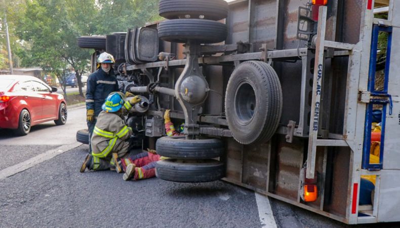 Un camión volcó luego de accidentarse en el kilómetro 38, carretera Panamericana en Santa Cruz Michapa, Cuscatlán, en el hecho también se vio involucrada una motocicleta. Dos personas resultaron lesionadas en el accidente.