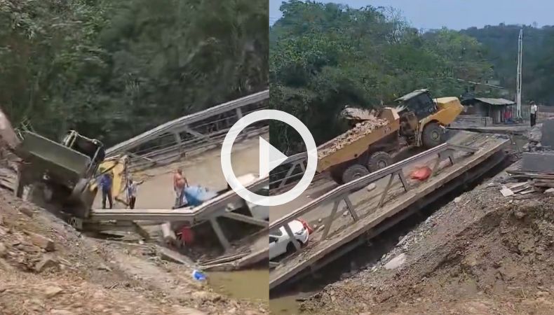 Con las imágenes compartidas, se puede observar a varios vehículos de construcción en el puente quedaron atrapados tras fuerte colapso.