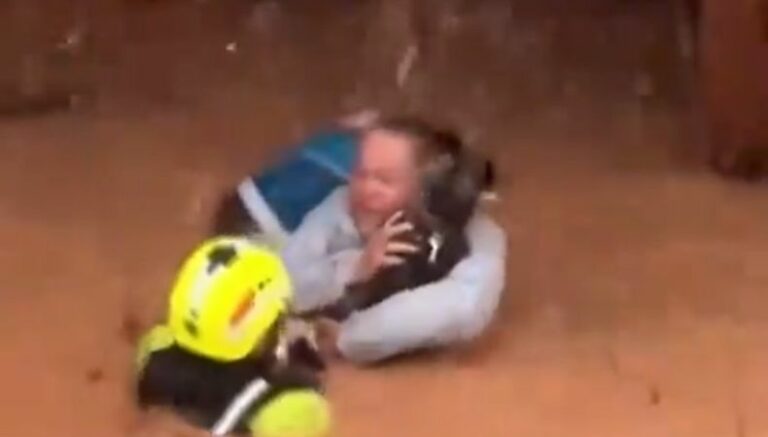 Además, por las imágenes se ven las graves inundaciones en el país, las cuales se aprecia que la grave situación en la zona. Asimismo, la mujer y el rescatista se encuentran con el nivel del agua casi por completo de sus cuerpos, quedando solo sus cabezas al descubierto. Incluso, se observa en medio de la lluvia seguían realizando la valiente labor.