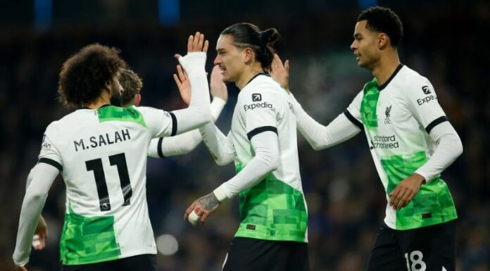 La segunda anotación del los visitantes llegó hasta el tramo final del encuentro. El balón llega a los linderos del área para Luis Díaz, quien descargó con un grandioso taconazo para la llegada de Diego Jota. El portugués la mandó a guardar con un remate a ras de piso entre las piernas del guardameta James Trafford al 90′.