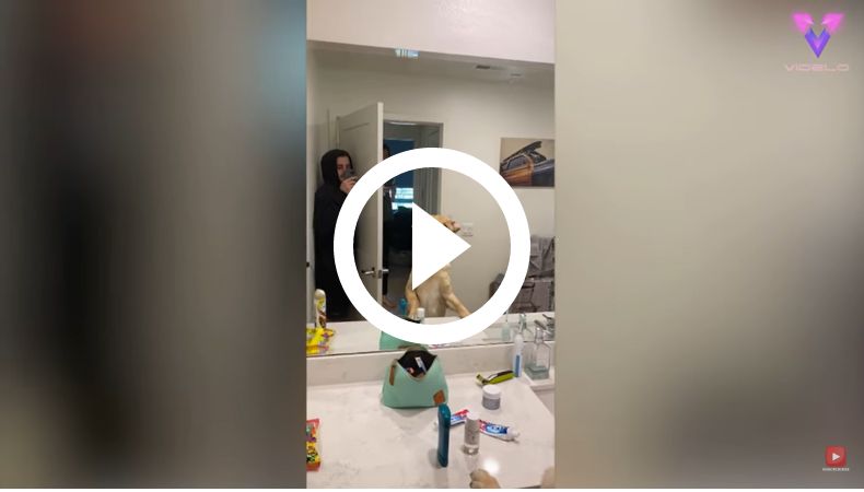Tal y como se puede apreciar en la imagen, la mascota entra al baño, comienza a registrar, poco a poco, el tocador (pero por la parte inferior), luego se va a la tina, donde también se asegura que ahí no hay nadie. En la escena aparece otra persona, una mujer que se encuentra grabando con su celular.