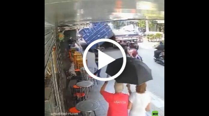 El contenedor parece estar mal asegurado y cae justo en el momento en el que el segundo motociclista iba pasando a la par del tráiler. El conductor, en cuestión de segundos, parece saltar y correr hasta la acera, para evitar morir aplastado.