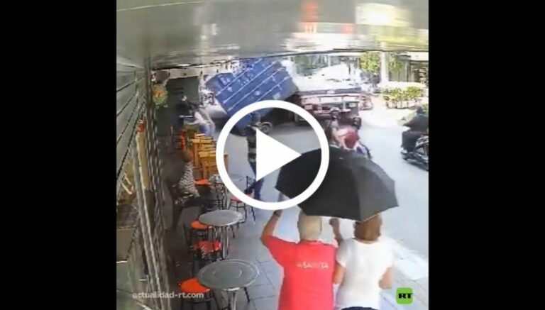 Como se puede observar en el video, una cámara de seguridad se encuentra grabando a los comensales de un local cercano, una calle y los automotores que pasan por el lugar. Se aprecia como un tráiler circula con un contenedor de carga. A la par cruza una pareja en una motocicleta, detrás viene otro motociclista, pero, de pronto, algo inesperado sucede.
