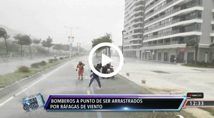Un video circulado en internet captó el momento justo en que cuerpos de bomberos luchan contra los inclementes vientos que están azotando a China por el paso del tifón Talim.