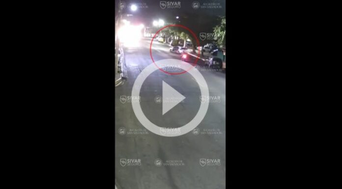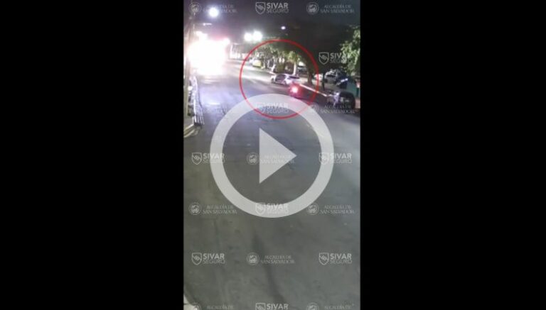 Una cámara del sistema de videovigilancia de Sivar Seguro captó el momento exacto de un accidente de tránsito en la avenida Bernal, en San Salvador. En el video se puede observar como el automóvil se detiene a la orilla de la vía y de un momento a otro realiza un giro indebido y no se percata que un motociclista venía en trayecto y termina impactándolo con un constado del vehículo.