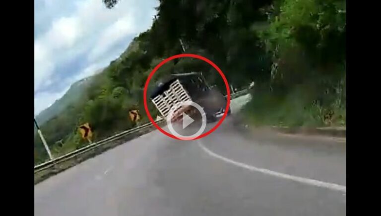 En el clip se muestra cómo el camión se tambalea de un lado para otro, cruzándose de carril, y luego pareciera que pierde el control en una curva y el peso lo hace voltearse.