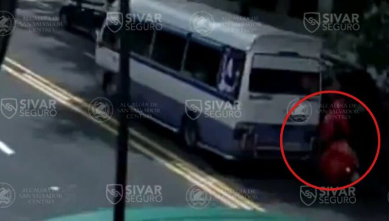 Las cámaras de videovigilancia de Sívar Seguro captaron el momento en que un microbús y un motociclista se vieron involucrados en un siniestro vial sobre la Alameda Roosevelt, frente al Parque Cuscatlán.