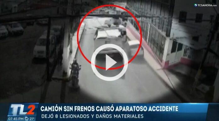 Una cámara de seguridad captó el momento exacto en el que un camión sin frenos provocó un aparatoso accidente de tránsito en la zona centro de Huixquilucan, Estado de México, dejando como saldo ocho personas lesionadas.
