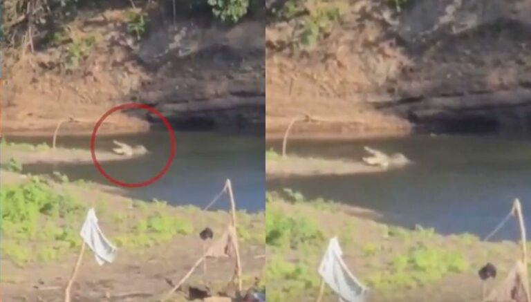 Los pobladores del caserío Santa Fidelia, cantón La Canoa, en San Miguel Centro, pasaron un gran susto al ver a un enorme cocodrilo tomando el sol a la orilla del río. El momento exacto del avistamiento quedó captado en un video, donde se muestra cuando el reptil abre su hocico. Esta es una práctica común de esta especie para regular su temperatura corporal, ya sea para enfriarse o calentarse.