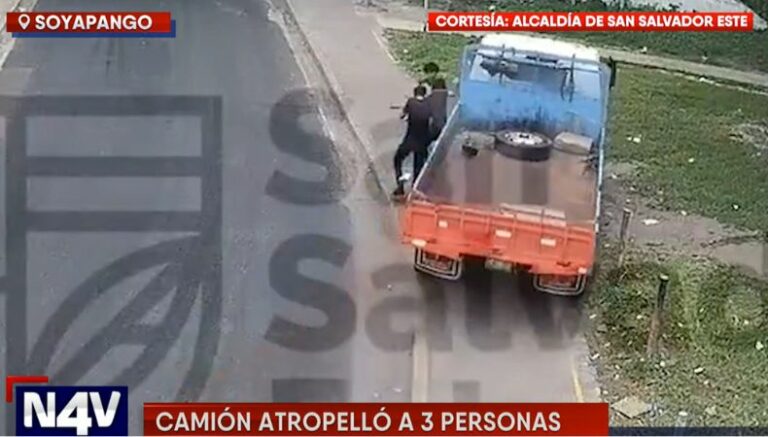Las cámaras de seguridad del distrito de Soyapango, San Salvador Este, captaron el momento justo de un accidente de tránsito. Se trató de un camión que atropelló a tres peatones que se encontraban en la acera, sin embargo, uno de ellos resultado con lesiones. El suceso se registró en el túnel cercano a un centro comercial del dicho distrito.