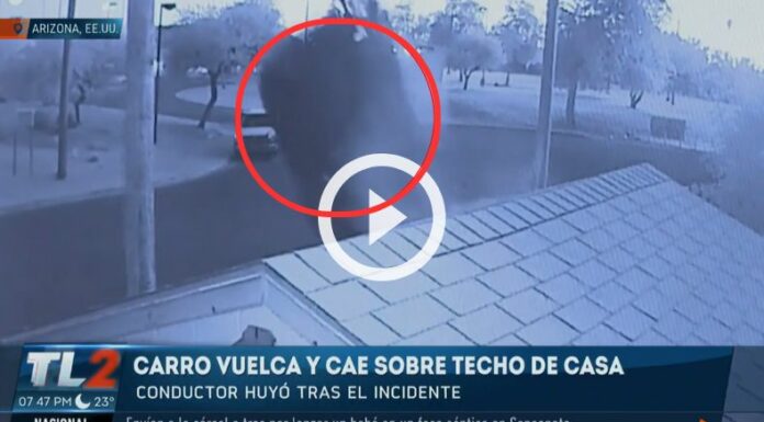 Un accidente ocurrió en Arizona. Como se puede observar en el video captado por cámaras de seguridad, un auto chocó contra un poste y terminó sobrepasando el techo de una casa.