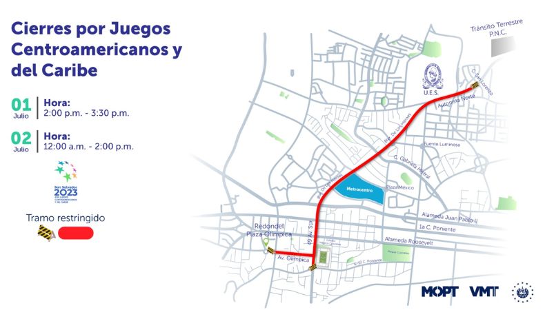 1 y 2 de julio, estará cerrado el tramo de la avenida Olímpica, la 49 avenida Sur y bulevar Los Héroes hasta el inicio de la autopista Norte.