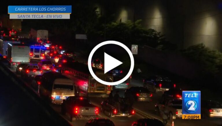 Gracias a un enlace en vivo con el periodista, André Sandoval, podemos observar cómo, en la incorporación al tramo de Los Chorros, saliendo del bulevar Monseñor Romero, se aprecia un panorama totalmente paralizado. A pesar de que permanecen gestores de tránsito para controlar la situación, no es suficiente para la cantidad de vehículos que circulan por la zona.