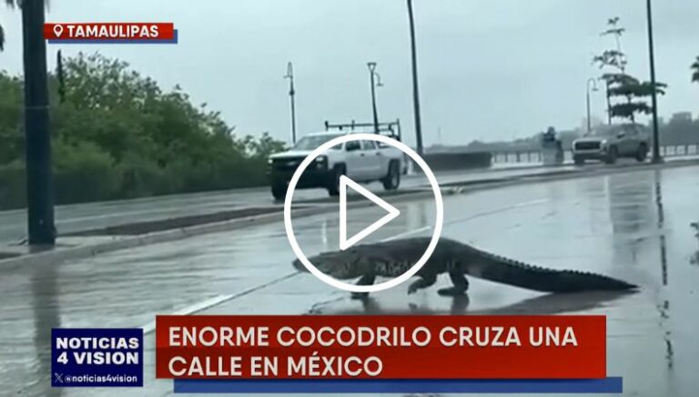 Tal y como se puede mostrar en la imagen, en medio de la lluvia, un enorme cocodrilo caminó tranquilamente, asustando y poniendo en cierto riesgo a los conductores que se dirigían sobre la carretera. A pesar de que su paso es lento, el tamaño del reptil impide circular con normalidad por la zona.