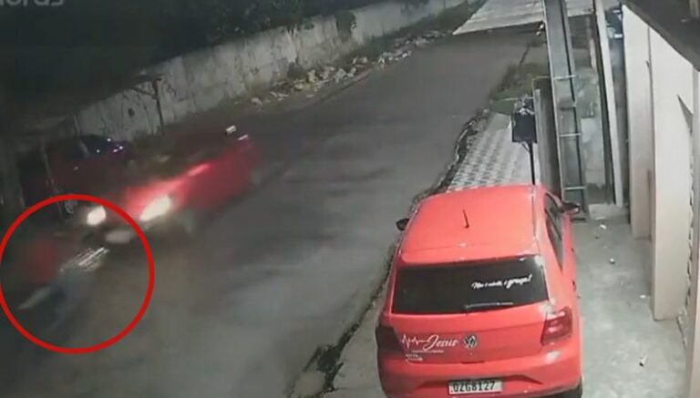 El incidente fue grabado por las cámaras de seguridad, donde se puede ver cuando aparece un auto rojo circulando por la calle y la víctima aparece subida en una motocicleta y termina chocando de frente con el vehículo.