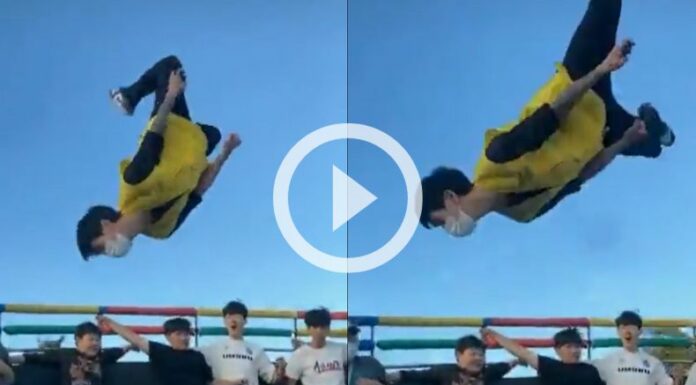 Tras ganar impulso, el joven se eleva en el aire y realiza un salto impresionante, que lo deja suspendido durante unos breves instantes. Posteriormente, el coreano desciende con una pose verdaderamente asombrosa, manteniendo su equilibrio en el juego mecánico que sigue en constante movimiento.