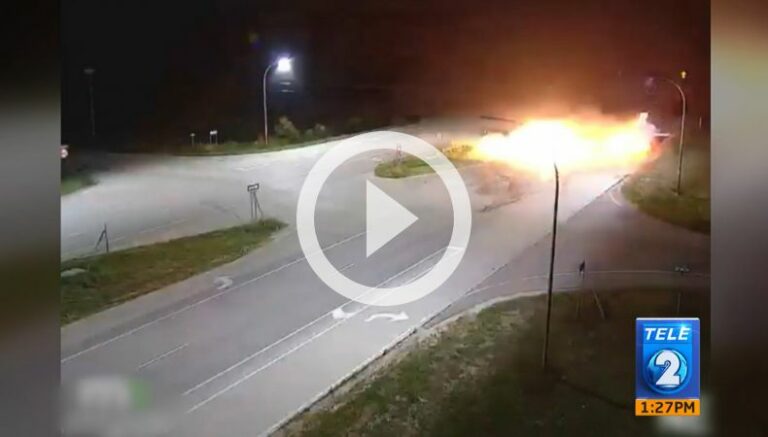 Por lo rápido en que sucede, todo el carro termina saliendo del carril cubierto de llamas, mientras que el tráiler sigue su recorrido completamente incendiado.