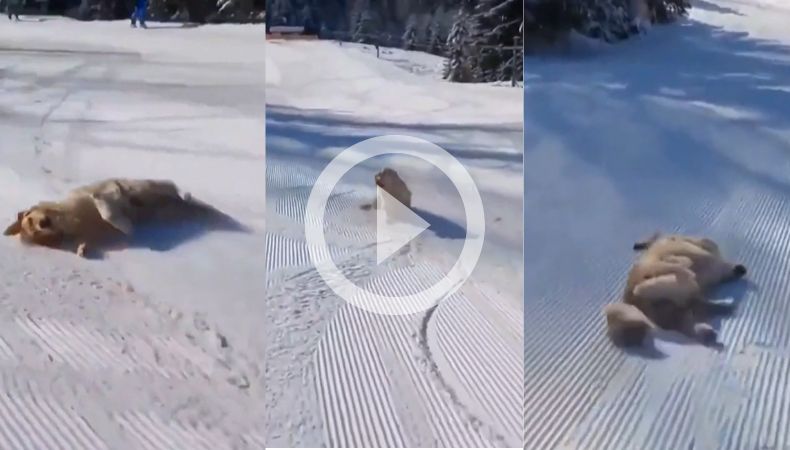 La nevada no presenta un problema para la mascota y al contario junto a sus dueños él decide esquiar de una forma peculiar lanzando su propio cuerpo en el fresco hielo. Por el terreno que es alto y con un pronunciado desnivel, este ayuda a que el canino se deslice acostados por varios tramos.