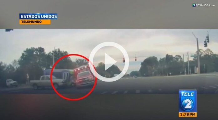 En un video compartido por Patrullas de Carreteras de Florida (FHP, por sus siglas en inglés), se observa que la ambulancia se salta un alto e interrumpe el tránsito de dos automotores: un pick up y un autobús escolar. Debido al fuerte impacto, el vehículo médico termina volcado en la carretera.