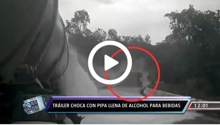 Desde un inicio se puede observar cómo el cargamento ya se inclina hasta un costado, mientras que el cabezal, debido al mismo peso del tráiler, trata de mantener su dirección en el centro. De un momento a otro, pierde completamente el control y sucede el impacto.