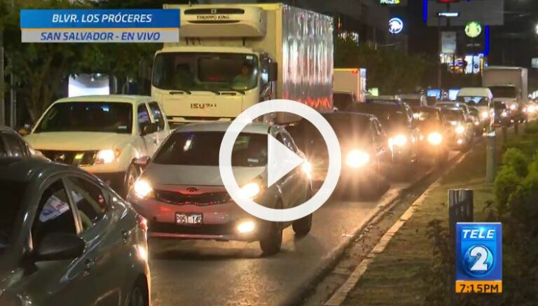Nuestro periodista André Sandoval se encuentra en el bulevar de Los Próceres y nos muestra cómo se encuentra el tráfico vehicular a esta hora de la noche. Por el momento, hay fuerte congestionamiento para los automovilistas que vienen desde el bulevar Monseñor Romero y que se dirigen hacia San Salvador o la autopista a Comalapa.